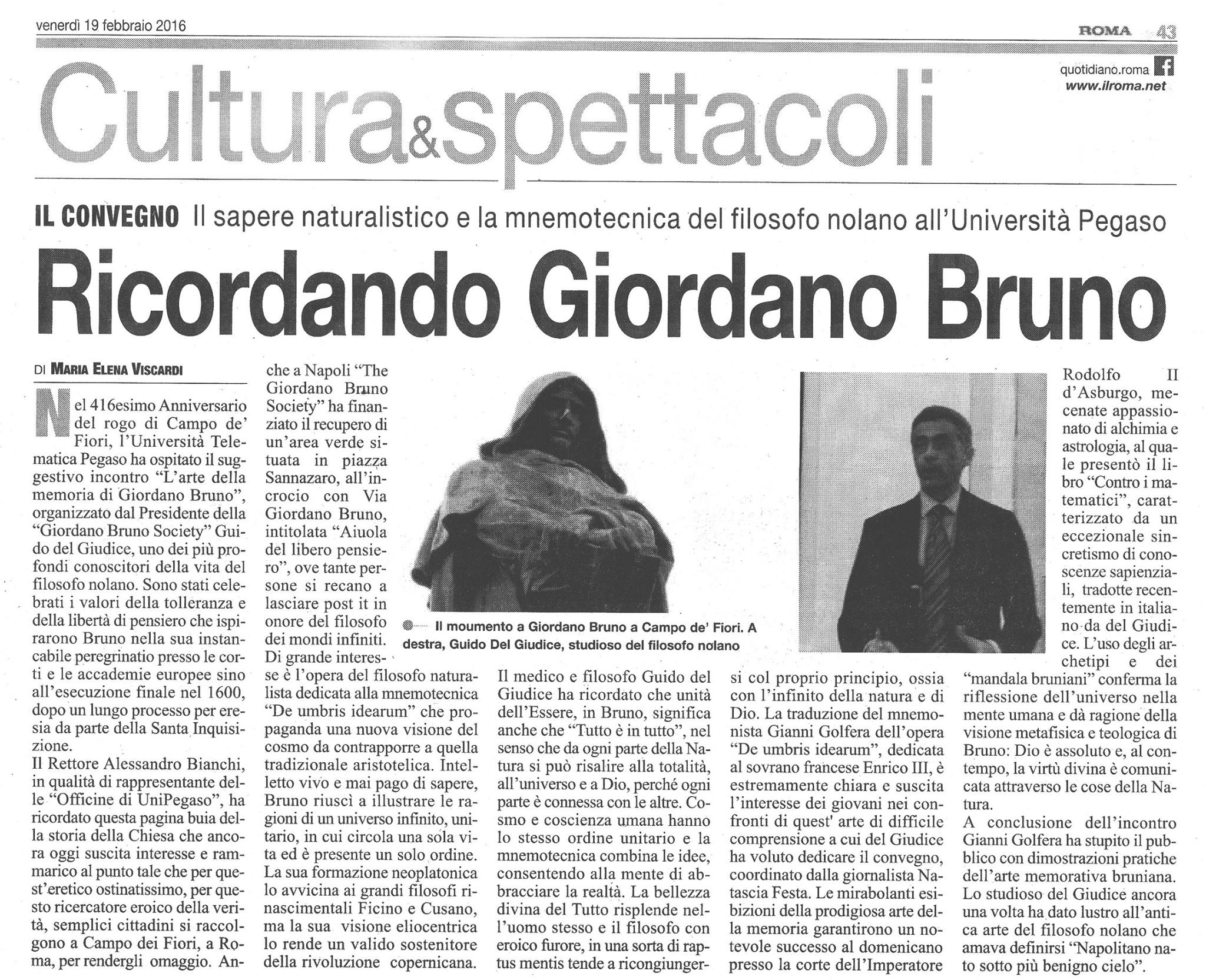 Mercoledì 17 febbraio 2016, 416° anniversario del rogo di Campo de’ fiori, nella sala convegni dello splendido Palazzo Zapata, l’Associazione “The Giordano Bruno Society”, in collaborazione con la Pegaso Università Telematica, ha organizzato il convegno “L’arte della Memoria di Giordano Bruno”.